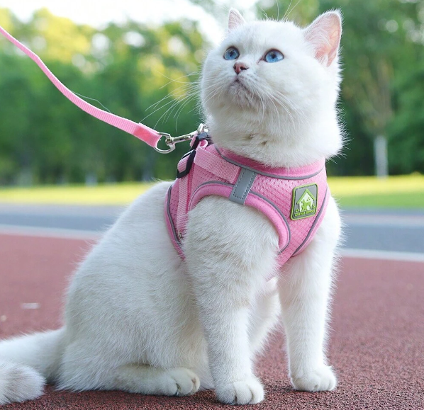 A medium-sized pet harness and leash set featuring a comfortable chest and back strap design. The set includes a pink mesh harness with reflective elements and a matching pink leash, perfect for safely walking cats or small dogs.