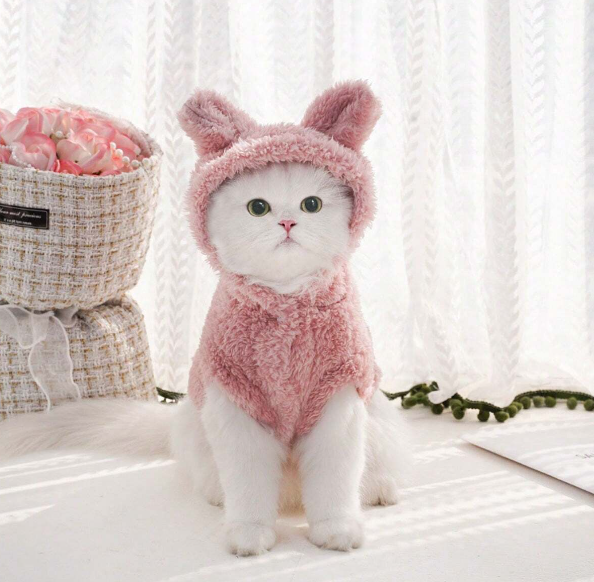 This medium-sized pet hoodie features a charming bunny ear design in soft pink plush material. Perfect for keeping your pet cozy and stylish, this hoodie combines comfort with adorable aesthetics for a delightful pet accessory.
